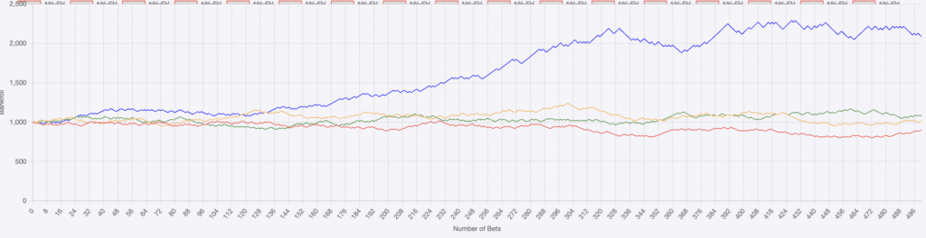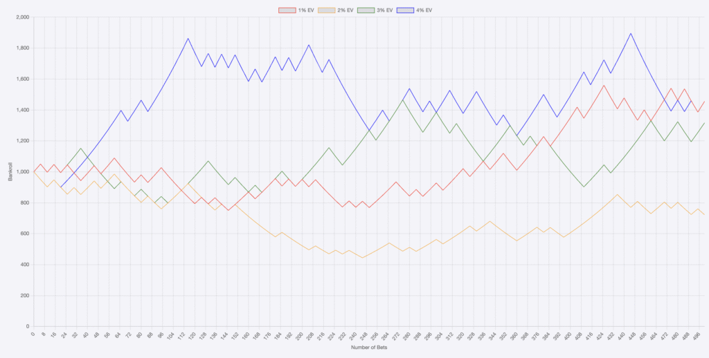 If you look at this graph, there are % EV edges that you have. And let’s assume they are calculated successfully. You can see below with a 500 bet sample, starting bankroll of a modest $1000, and +100 (even odds) that with Non-correlated bets you still will have wild variance. In this model 3% and 2% outperform 4% EV edges.